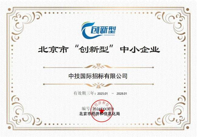 近日,北京市经济和信息化局已公布2024年度第十一批创新型中小企业名单,通用技术中技招标成功被认定为北京市“创新型”中小企业。“创新型”中小企业的称号是企业创新能力的认证标志,体现了中技招标较强的创新能力和发展潜力,为公司高质量发展提供了重要支撑。